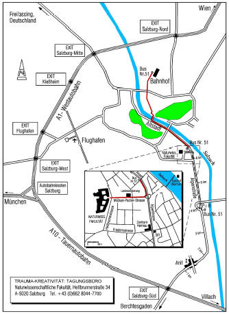 Hellbrunnerstr. 34 A-5020 Salzburg t. +43 (662) 8044 2465 Wie komme ich zum Verasnstaltungsort? Vom Bahnhof: Bus Nr. 51 Richtung Alpensiedlung, Aussteigen: Haltestelle Faistauer Gasse. Vom Flughafen: Bus Nr. 77 Richtung Bahnhof, Umsteigen in Linie 51, Aussteigen Faistauer Gasse Mit dem Auto: Tauernautobahn Abfahrt Salzburg Süd, Richtung Salzburg, Alpenstraße bis Michael-Pacher-Straße/